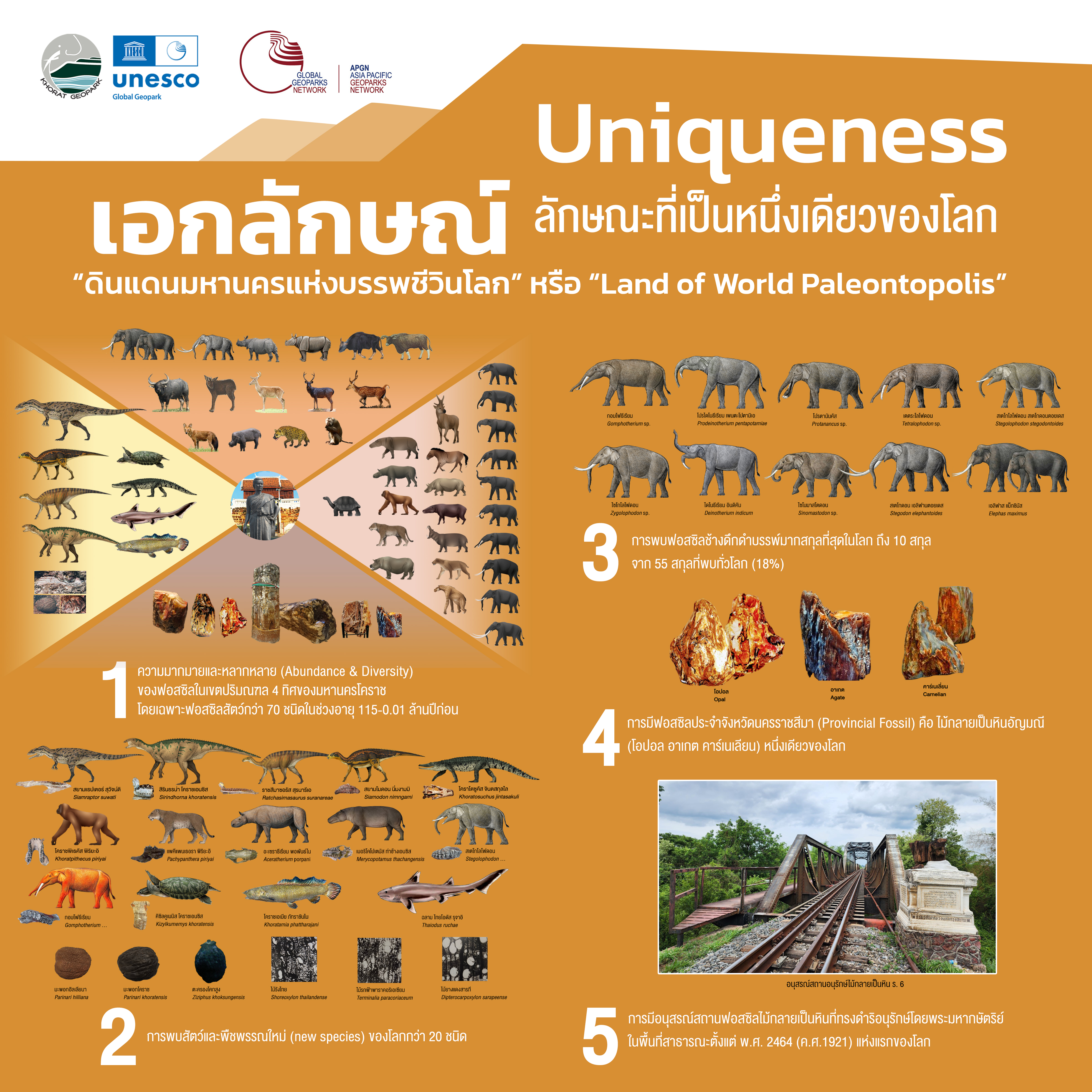 Unique geological features include the numerous and diverse fossils of dinosaurs and contemporaneous animals found in the calcareous conglomerate and sandstone layers in Mueang Nakhon Ratchasima District, Nakhon Ratchasima Province. Fossils of ancient elephants and contemporaneous animals, as well as petrified wood, are found in the loose sedimentary and gravel layers in Chaloem Phra Kiat District, Mueang Nakhon Ratchasima Province, and Kham Thale So District. This makes it possible to call Khorat the World Paleontopolis.