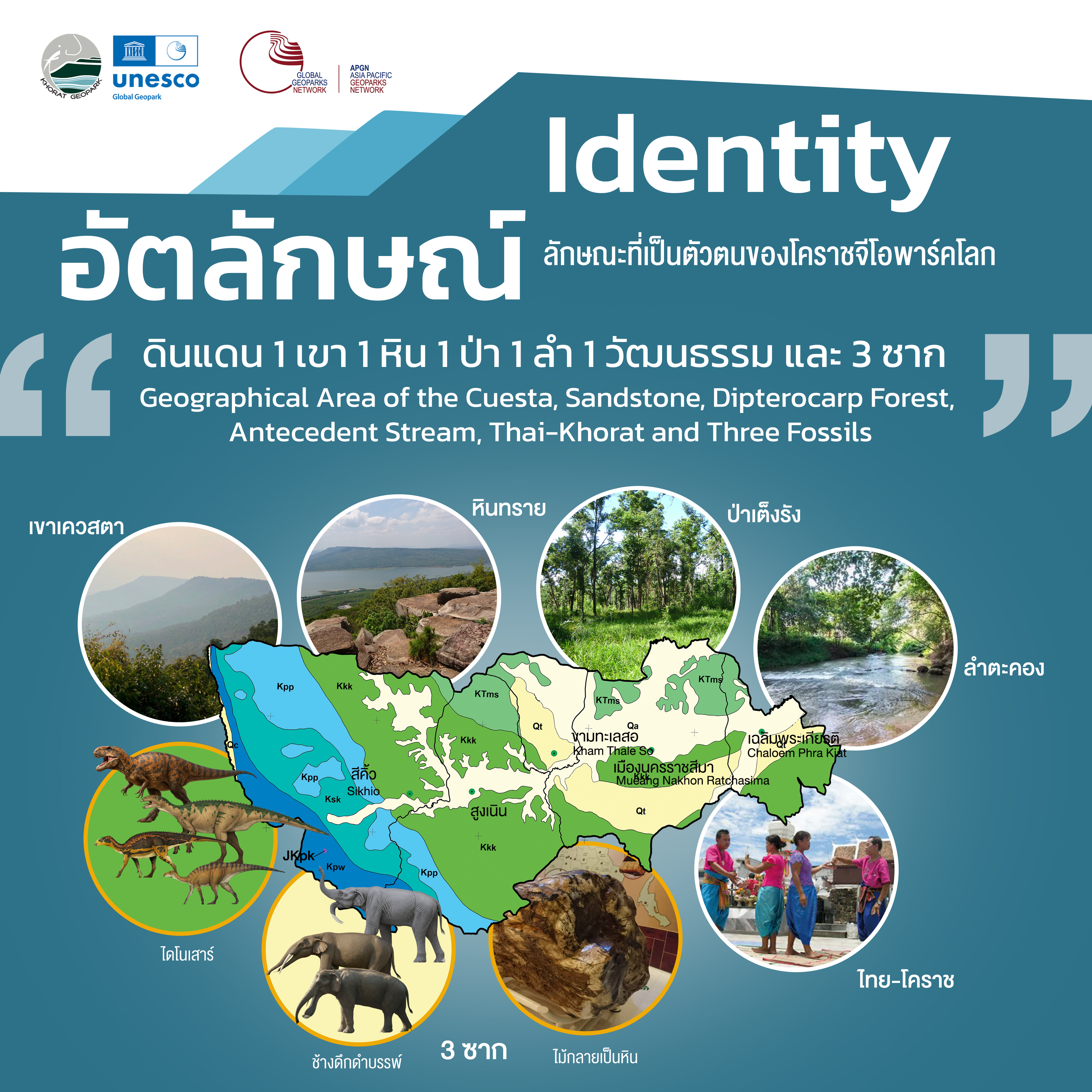 Khorat Geopark is not only rich in natural heritage, but also diverse and unique in languages, food, and cultures from six ethnic groups. The geopark has a long cultural history related to its geological heritage such as the Neolithic tools made of fossil wood, pictographs on sandstone, the 10th-century A.D. stone sanctuaries (also known as Prasat Hin) from the Khmer Empire, the ancient city wall from the middle decades of the 17th century and other interesting intangible heritage. There are no other UNESCO Programmes overlapping in the geopark area.